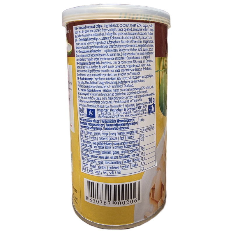 Hauchdünne geröstete Chips aus Kokosnussstreifen. Ganz leicht gesalzen & gezuckert.