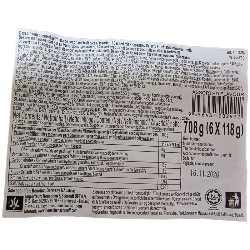 Zutaten: Wasser, Zucker, Kokosgel 6,5 % (Kokosöl, Zucker), gewürfelte Früchte 6,5 % (Jackfrucht, Mango, Honigmelone, Ananas), Apfelsaft, Milchpulver, Geliermittel: E407, Palmöl, Aroma, Säureregulator: E330, Emulgator: E471, Farbstoffe: E102, E129, E133. E102 und E129 können die Aktivität und Aufmerksamkeit von Kindern beeinträchtigen.